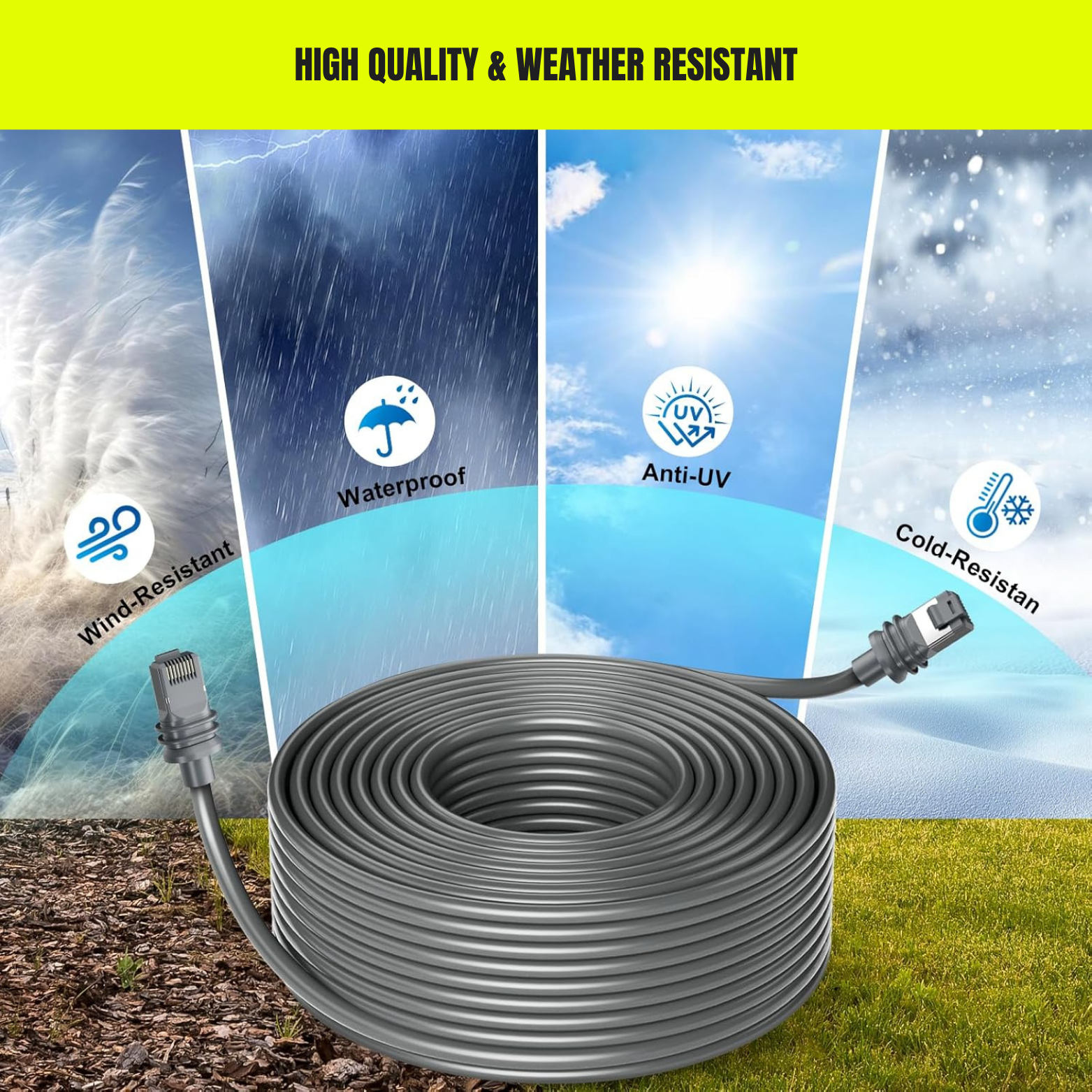 Designed for outdoor use, this Ethernet cable features a durable, weather-resistant construction that protects against: