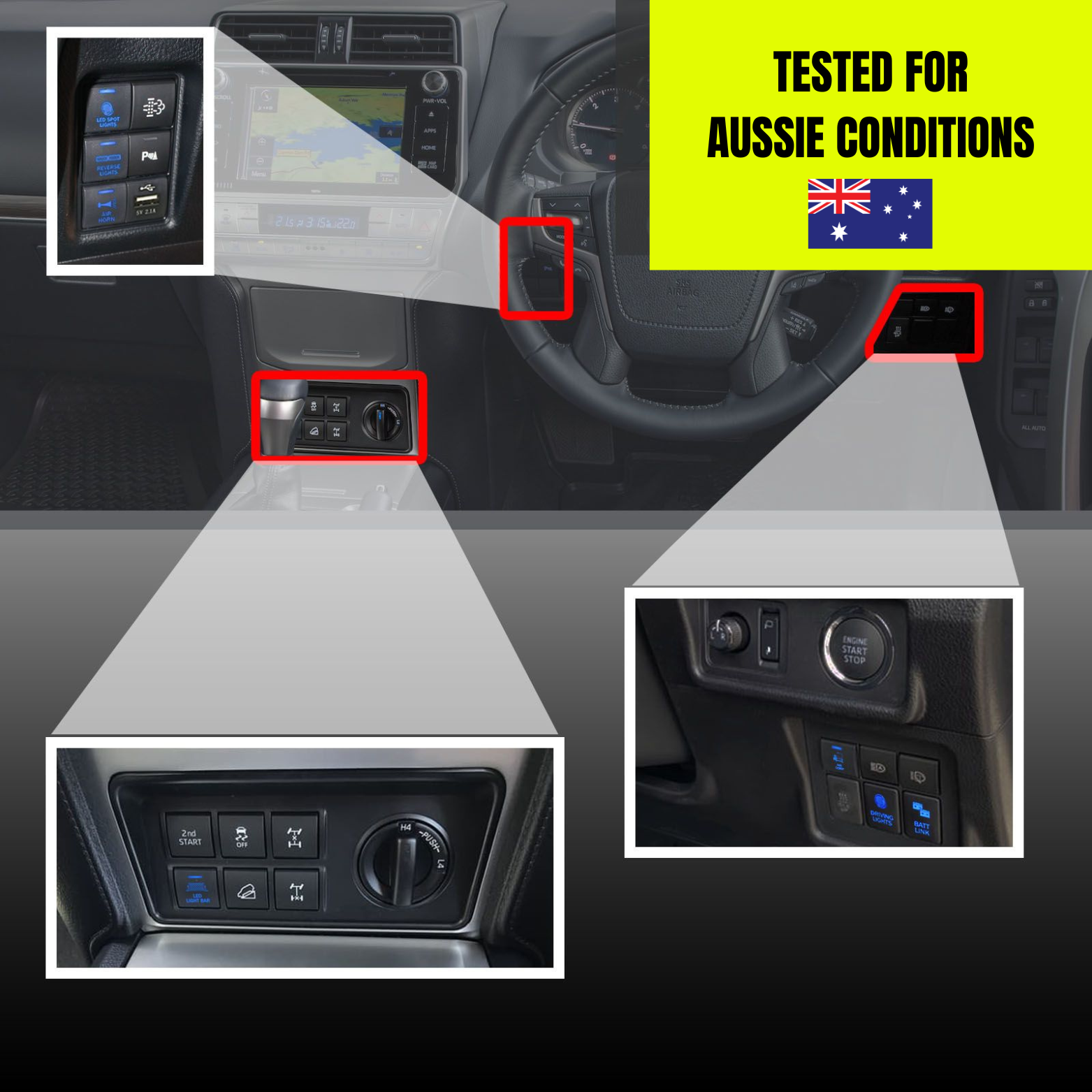 Designed to suit Toyota models using the OEM 22 mm square switch layout: